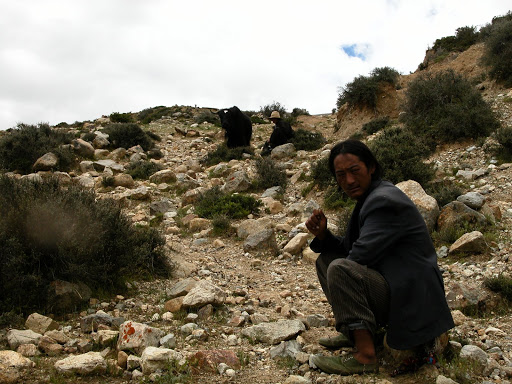 天渐晚,路遇十多个藏族回村,我找了个很棒的地方搭帐篷,只是需要下一个小坡: