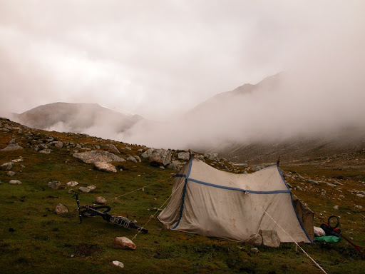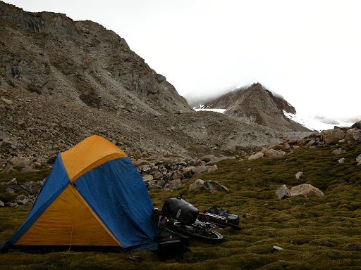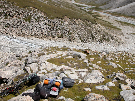 最后,把行李拆了把车从围栏下面塞过去,越过一条小溪,扎营在5485米海拔的一个很棒的草地上: