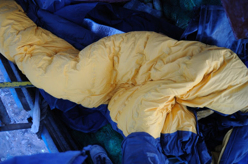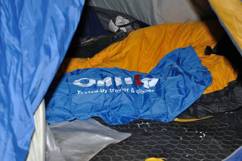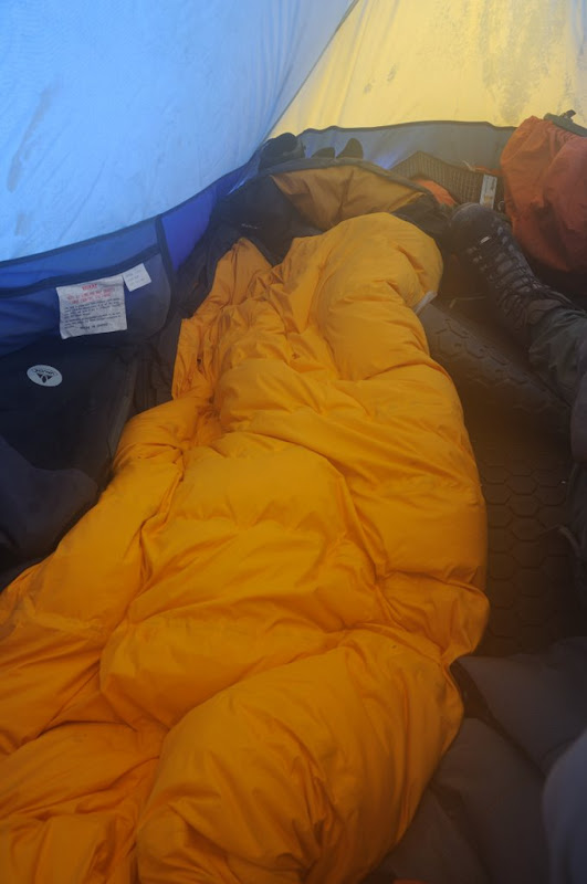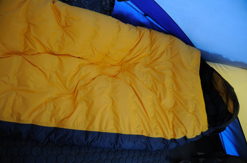 这款睡袋是我从OnTrip公司定制的一条全新概念的压胶防水羽绒睡袋,让我在帐篷内使用的时候更为方便,不用刻意注意烧水做饭时的泼水。