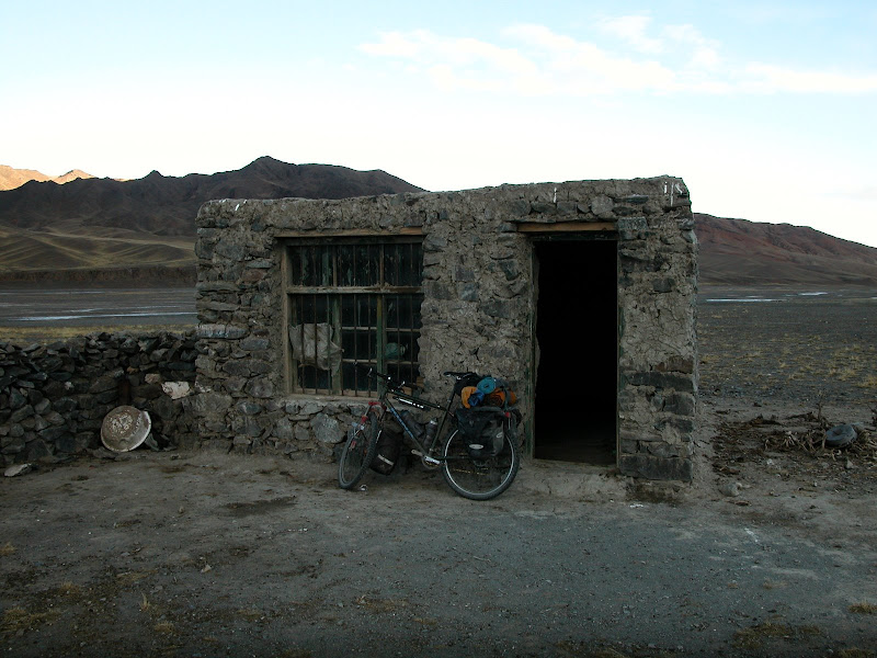 边骑边疑惑是否走错了路,起风了,前方远处是山坡,方佛有房子,赶到36km(今日共76km)发现有一个空屋子,门没锁,门和屋里都有血迹,不知是否在此宰杀过牲口。决定住下,查看地图再研究明天的行程。