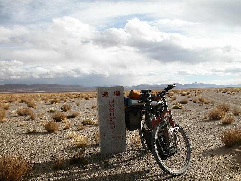 将近4点离开荣玛乡,之后的数据以荣玛乡为起点。出来7km有村庄和岔路,左边的路偏向西北,可能是去温泉的,右边去措折强玛乡。20km有铁桥和房屋,本来想问路,但是我在桥上一回头发现房间里面的人赶忙关门,顿时觉得一阵恶心,继续前行。24km左右遇到岔路,右边的路似乎是绕依布查卡的,放弃,前行看到了羌塘保护区的界碑: