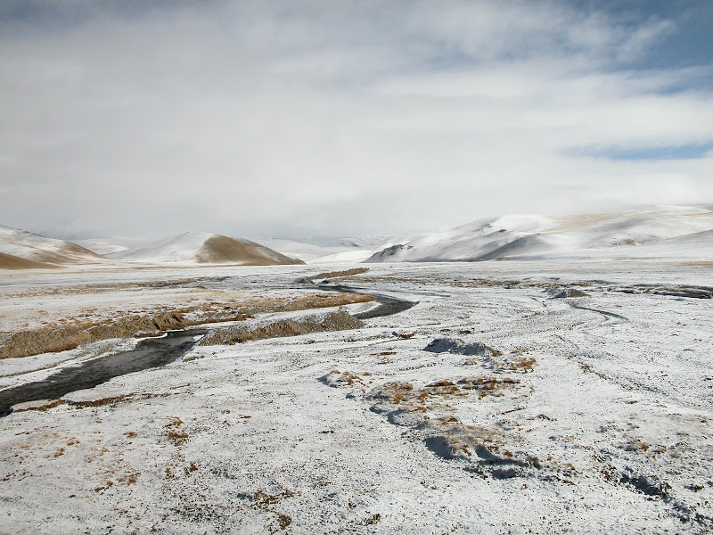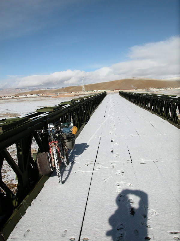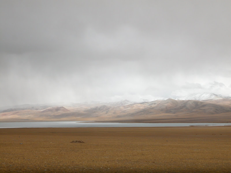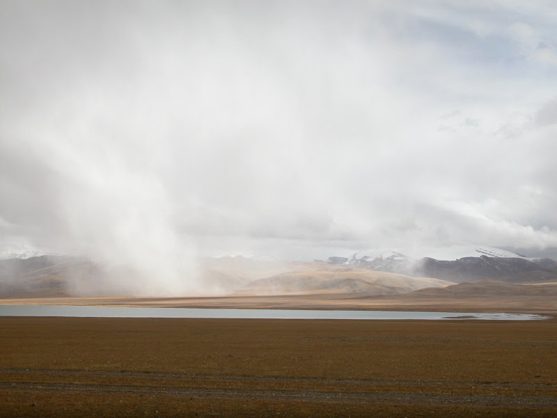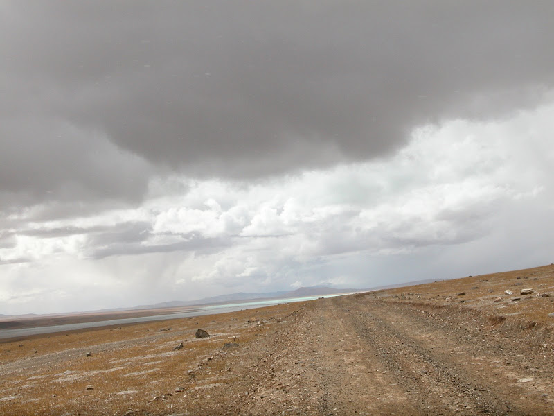 大风,小冰雹一起袭来。更惨的是在一段刚开始的下坡中,爆胎了。没有可以躲避风雨的地方,于是我停下来不紧不慢的补胎,因为我知道紧张只会忙中出乱。很巧,风小了,冰雹几乎也停了。继续上路,50km遇到了更大的风和冰雹。路上小湖泊不断,可是天气很糟糕。