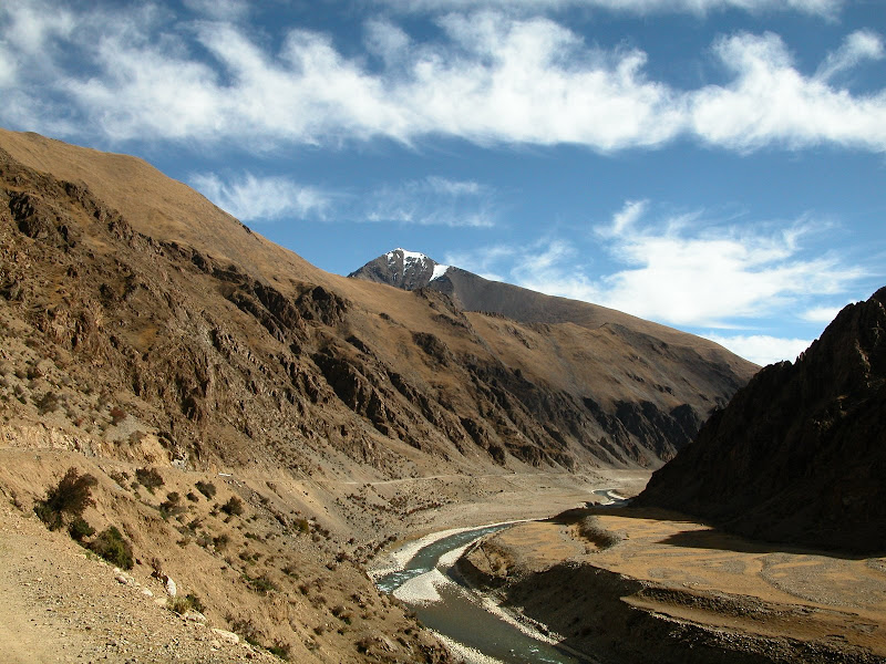 43km有工地帐篷,再次饿了,讨饭吃。这段修路较多,不是很好走,虽然沿着河流缓下,却没有很爽的感觉。对于这种无趣峡谷的道路,让我想起了进昌都之前的扎曲。