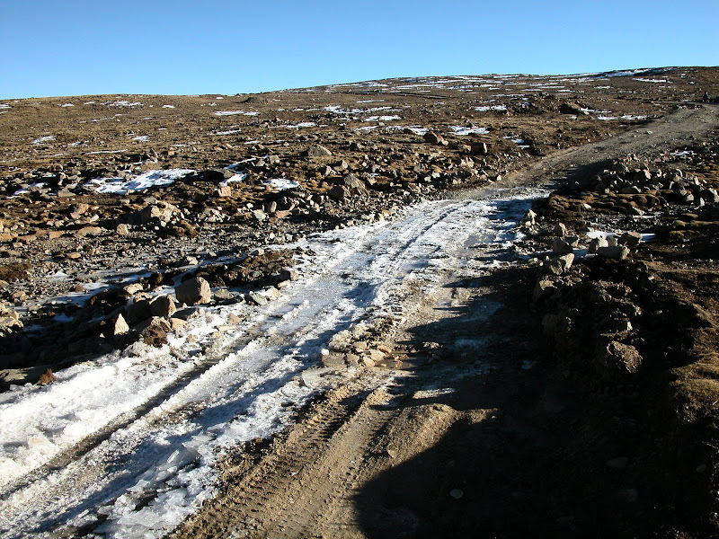 8点50才出发。出来2km,路上有冰雪,下坡速度快,手又是僵硬的,没有刹住车,摔了我在西藏的第一跤,之前都是车摔人不摔。我从地上爬起来,双手撑住双膝,过了几分钟才能放手站直腰。给这具有纪念意义的地方留影。