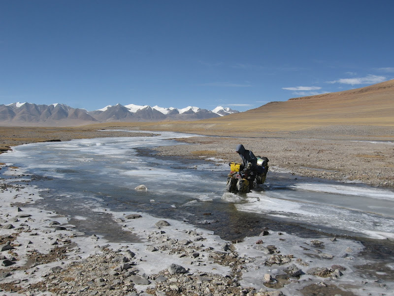 眼前的帕龙错则不属于这个大湖的一部分,因为它的湖面海拔已经高达5100米,属于另一个流域。为了到达湖边,我们半骑半推着车,翻过了5300米的让瓦拉山口。这里是短暂的夏季牧场,牧民们已经撤到海拔更低的冬季牧场,空旷平坦的地形让我们无处避风,只能找了一个羊圈扎营,但是没多大用处,丁丁那顶用了5年的帐篷,哗哗地响了整整一夜。夜晚,气温降到-20℃以下,不仅电子温度计的电池失效,自行车气压避震因低温漏气,水壶里的饮水也全都冻硬,只有枕在头下的水袋得以幸免。